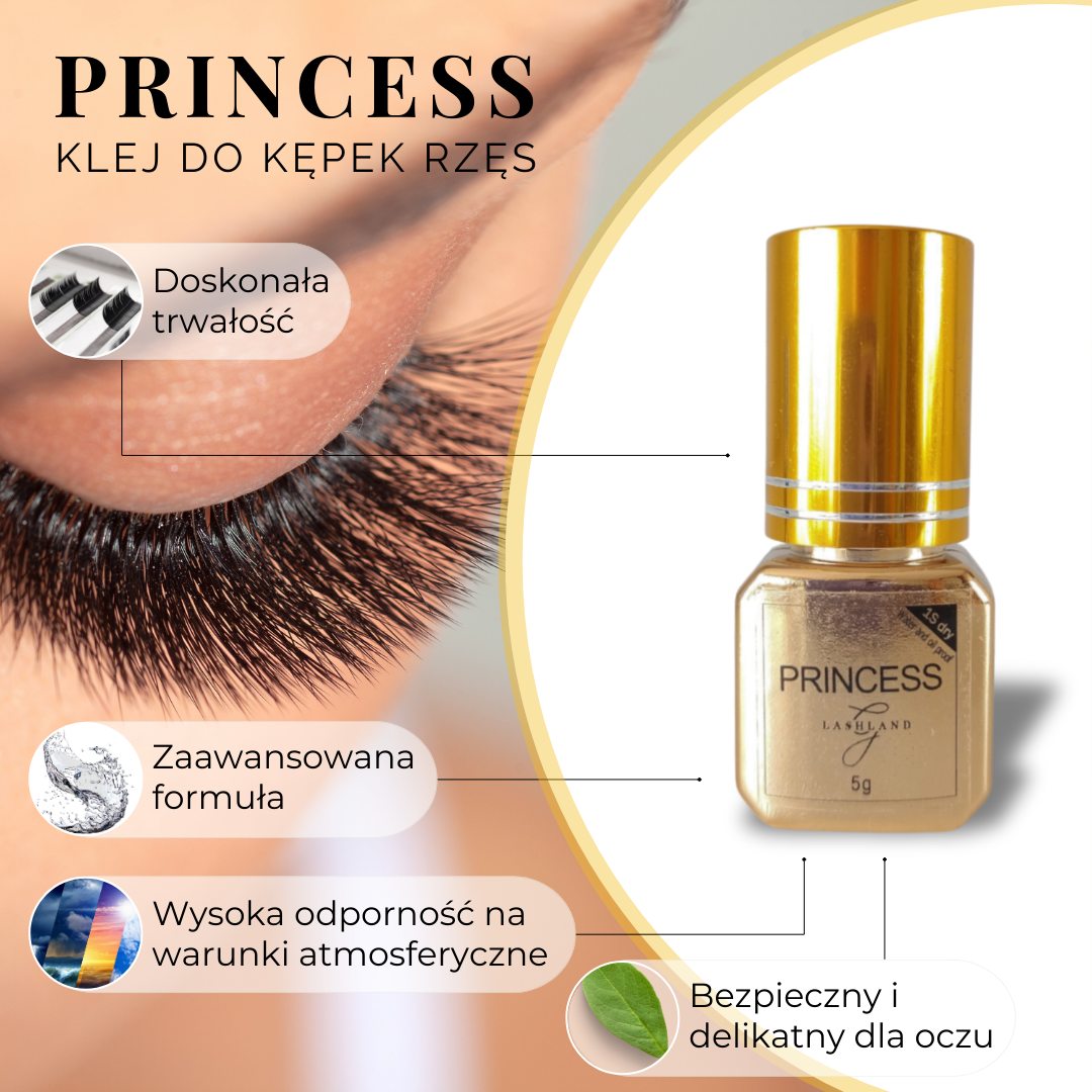 Princess to klej do rzęs o płynnej konsystencji, która pozwala na pracę bez tworzenia się grudek nawet najbardziej wymagającym stylistkom. Wiązanie tworzy się w szybkim tempie: 0,5-1 sekund. Dodatkowo produkt nie traci właściwości klejących i nie zasycha w pierścionku na klej przez długi czas. Jest w pełni odporny na pot oraz kosmetyki na bazie olejów. Ponadto klej jest doskonały na lato i towarzyszące mu upały.
